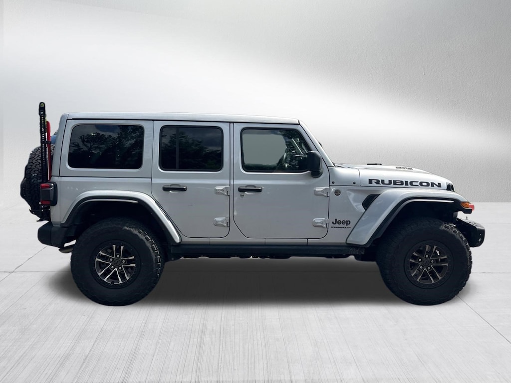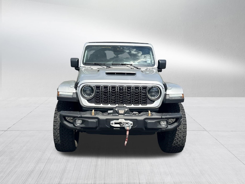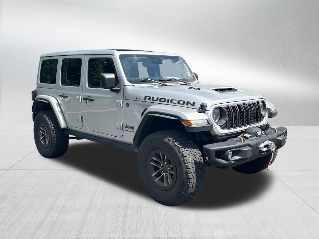 RUBICON 392 4X4, CERTIFIED PRE OWNED INCLUDES WARRANTY, SKY ONE TOUCH POWERTOP, 35 INCH TIRE PACKAGE, UCONNECT 5 NAVIGATION WITH 12.3 INCH TOUCHSCREEN, REAR BACK UP CAMERA, AUTOMATIC TRANSMISSION, ADAPTIVE CRUISE CONTROL, BLIND SPOT & CROSS PATH DETECTION, FORWARD COLLISION WARNING PLUS, LEATHER INTERIOR, STEEL BUMPER GROUP, LED LIGHTING GROUP, COLD WEATHER GROUP, HEATED SEATS, HEATED STEERING WHEEL, SATELLITE RADIO, KEYLESS ENTRY, PUSH BUTTON START, REMOTE START, SIDE AIRBAGS, REAR PARK ASSIST SENSORS, UCONNECT VOICE COMMAND WITH BLUETOOTH, STEERING WHEEL MOUNTED AUDIO CONTROLS, POWER SEAT, DUAL ZONE FRONT CLIMATE, FACTORY SECURITY SYSTEM, ALLOYS, FOG LAMPS, TOWING PACKAGE / HITCH, TIRE PRESSURE MONITORING DISPLAY, ALL POWER AND MUCH MORE, CARFAX CERTIFIED, 1 OWNER, INCLUDES THE REMAINDER OF THE FACTORY WARRANTY, EXTENDED WARRANTY AVAILABLE, SOME OFFERS INCLUDE FINANCING WITH APPROVED LENDERS FOR ADVERTISED PRICE.. Silver Zynith Clearcoat 2024 Jeep Wrangler Rubicon 392 SRT HEMI 6.4L V8 MDS 4WD