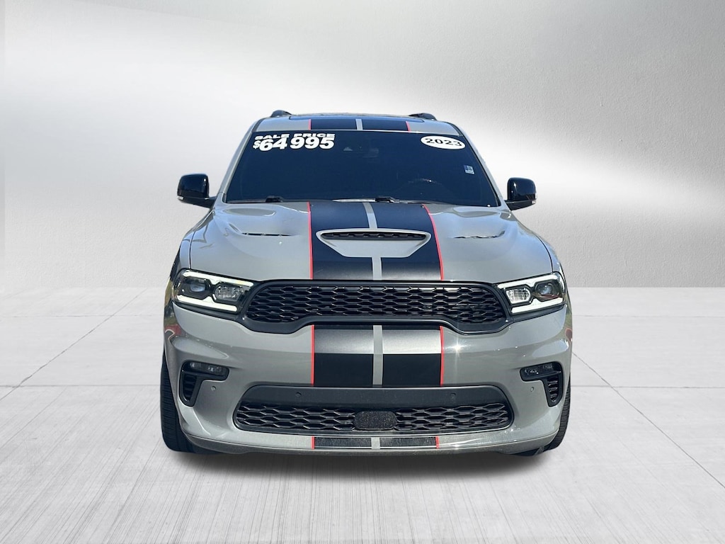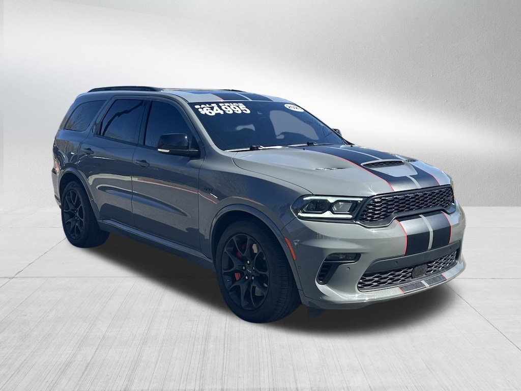 SRT WITH UPGRADES 392 6.4L V8 WITH PREMIUM PACKAGE AND BLACKTOP BLACKAGE AWD, KOOKS HEADERS, JLT INTAKE, BBK POWER PLUS 90 MM THROTTLE BODY, PERFORMANCE CAM SHAFT, UPGRADED EXHUAST, UCONNECT 5 NAVIGATION WITH 10.1 INCH DISPLAY, MOONROOF / SUNROOF, SURROUND VIEW 360 DEGREE CAMERA, FACTORY BLACK 20 INCH WHEELS, AUTOMATIC TRANSMISSION, ADAPTIVE CRUISE CONTROL, BLIND SPOT & CROSS PATH DETECTION, LANESENSE LANE DEPARTURE WARNING PLUS, FORWARD COLLISION WARNING PLUS, LEATHER INTERIOR, MIDDLE ROW CAPTAIN CHAIRS, 3RD ROW SEATING, HEATED SEATS, HEATED STEERING WHEEL, VENTILATED FRONT SEATS, HARMON KARDON HIGH PERFORMANCE AUDIO, SATELLITE RADIO, KEYLESS ENTRY, PUSH BUTTON START, REMOTE START, SIDE AIRBAGS, FRONT & REAR PARK ASSIST SENSORS, UCONNECT VOICE COMMAND WITH BLUETOOTH, STEERING WHEEL MOUNTED AUDIO CONTROLS, DUAL POWER SEAT WITH DRIVER MEMORY, DUAL ZONE FRONT CLIMATE, REAR ZONE CLIMATE, FACTORY SECURITY SYSTEM, POWER TELESCOPING STEERING WHEEL, FOG LAMPS, TIRE PRESSURE MONITORING DISPLAY, ALL POWER AND MUCH MORE, CARFAX CERTIFIED, INCLUDES THE REMAINDER OF THE FACTORY WARRANTY, EXTENDED WARRANTY AVAILABLE, SOME OFFERS INCLUDE FINANCING WITH APPROVED LENDERS FOR ADVERTISED PRICE.. Destroyer Gray Clearcoat 2023 Dodge Durango SRT 392 SRT HEMI 6.4L V8 MDS AWD