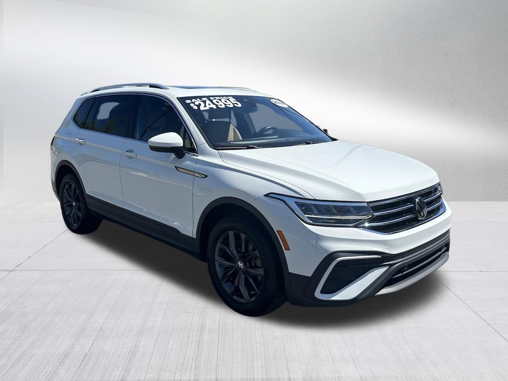 2.0T SE, PANORAMIC SUNROOF, CARPLAY, AUTO DIM MIRROR, 3 ROW MONSTER MATS, REAR BACK UP CAMERA, AUTOMATIC TRANSMISSION, BLIND SPOT & CROSS PATH DETECTION, FORWARD COLLISION WARNING PLUS, LEATHER INTERIOR, TOUCHSCREEN DISPLAY, HEATED SEATS, SATELLITE RADIO, KEYLESS ENTRY, PUSH BUTTON START, BLUETOOTH, STEERING WHEEL MOUNTED AUDIO CONTROLS, POWER SEAT, DUAL ZONE FRONT CLIMATE, FACTORY SECURITY SYSTEM, ALLOYS, FOG LAMPS, TIRE PRESSURE MONITORING DISPLAY, ALL POWER AND MUCH MORE, CARFAX CERTIFIED, 1 OWNER, INCLUDES THE REMAINDER OF THE FACTORY WARRANTY, EXTENDED WARRANTY AVAILABLE, SOME OFFERS INCLUDE FINANCING WITH APPROVED LENDERS FOR ADVERTISED PRICE.. Pure White 2024 Volkswagen Tiguan 2.0T SE 2.0L TSI DOHC FWD 23/30 City/Highway MPG